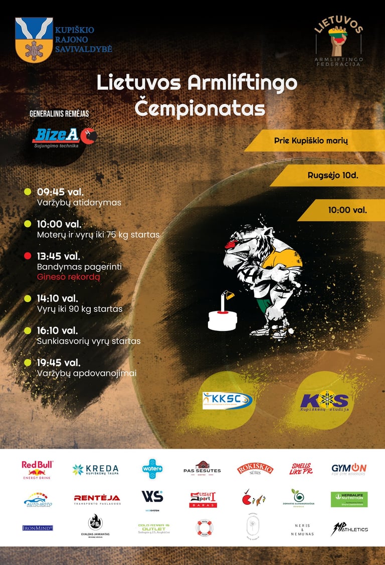 Lietuvos armliftingo čempionatas įvyks 2022-09-10 Kupiškyje prie Kupiškio marių. Lietuvos armliftingo čempionato startinis mokestis – 20 eurų. Varžybų žiūrovų laukia rėmėjų įsteigti prizai bei siurprizai. Lietuvos armliftingo čempionato dalyvio startinis mokestis pervedamas į Lietuvos armliftingo federacijos banko sąskaitą LT647300010171888530 mokėjimo paskirtyje nurodant dalyvio vardą, pavardę ir svorio kategoriją. Vykdoma išankstinę dalyvių registracija el. paštu info@armliftingas.lt. Registracijos pabaiga - 2022-08-31. Dalyviai, norintys užsiregistruoti varžybų dieną, moka 30 eurų startinį mokestį. Dalyviai, varžybų dieną norintys keisti svorio kategoriją, moka baudą – 10 eurų. Startiniai mokesčiai negrąžinami.